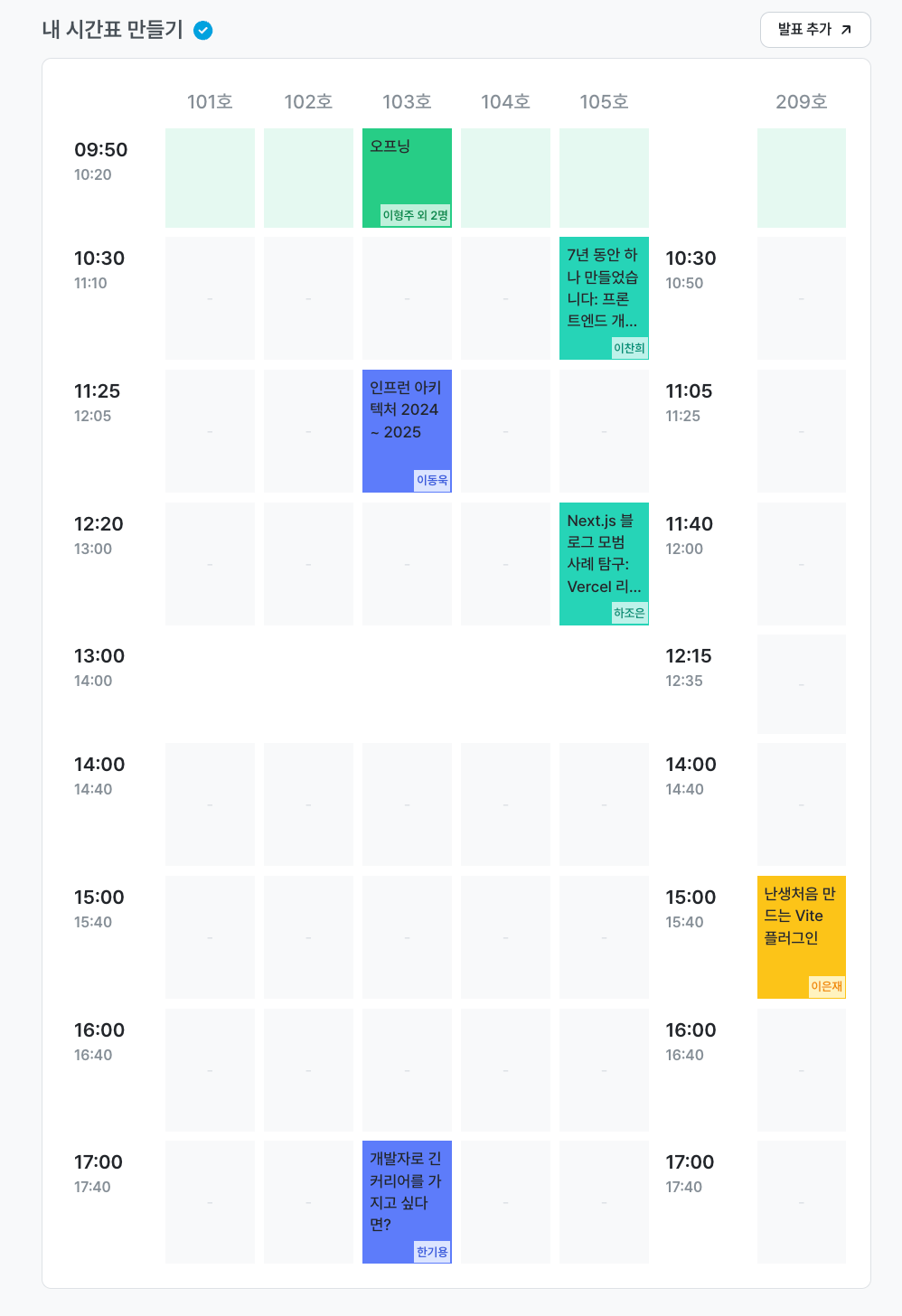 위에서 설문조사를 하면 My 인프콘 페이지가 생기며 여기서 듣고 싶은 강의의 시간표를 만들 수 있다.