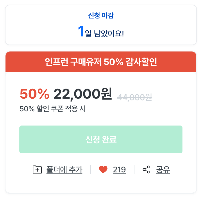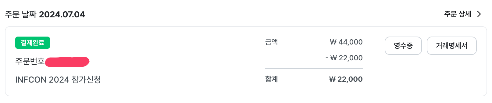 인프콘 2024 참가 신청 가격은 44,000원인데 인프런에 있는 강의를 구매한 유저는 50% 할인된 가격인 22,000원에 결제할 수 있다.