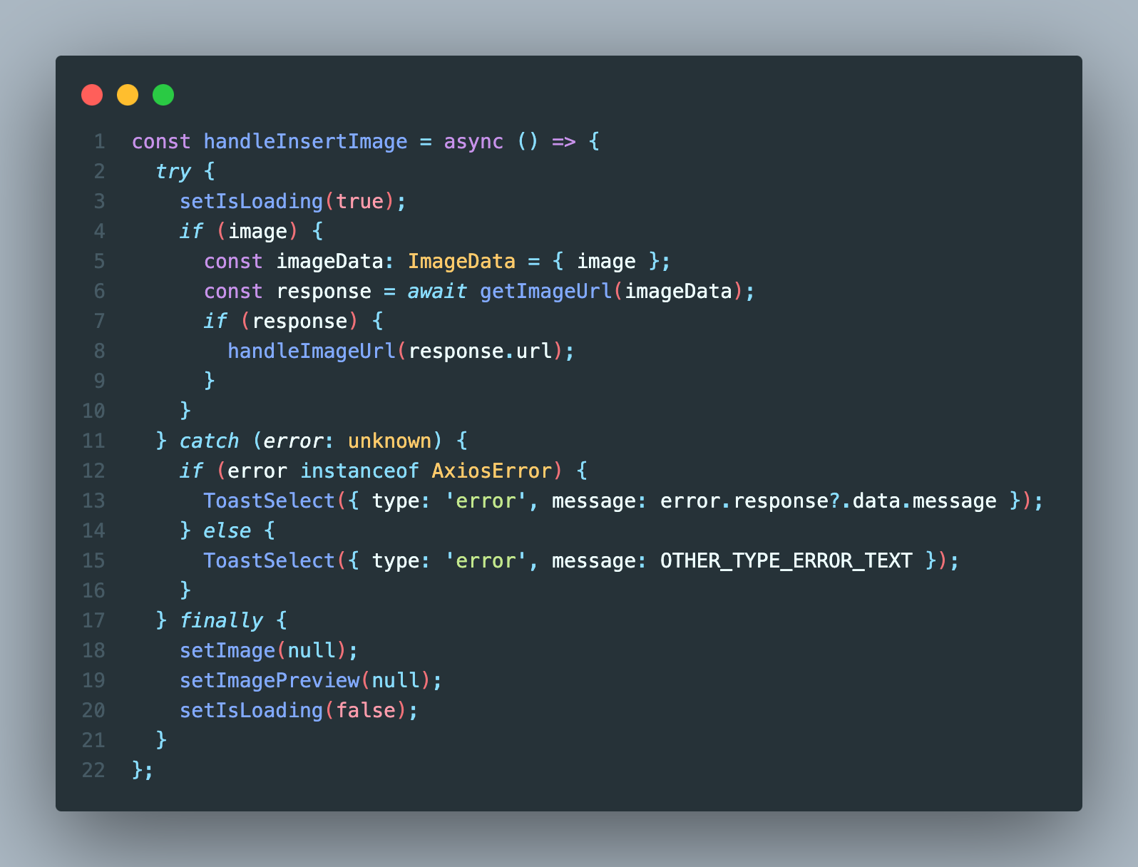 만약 오류가 발생할 경우 토스트창으로 오류 메시지를 보여주고 모든 동작을 마친 후에 이미지와 이미지 미리 보기 URL 을 초기화하였다.