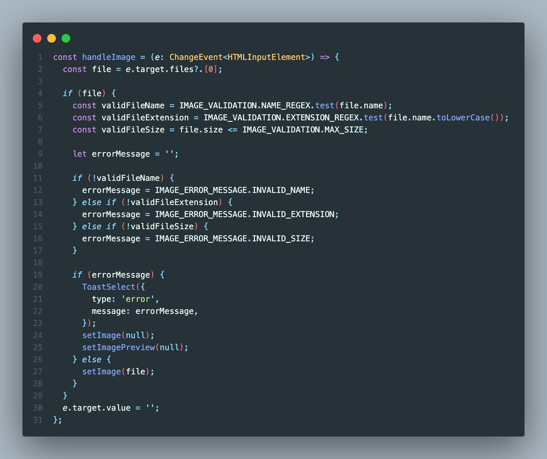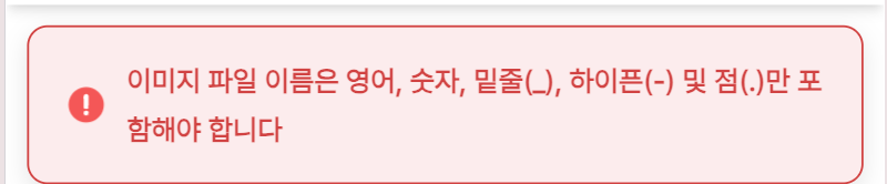 해당 프로젝트에서 사용 중인 백엔드에서는 파일명이 한글로 되면 에러가 발생하여, 프론트 측에서 미리 파일명 형식이 맞지 않을 경우 토스트창을 띄워 경고 메시지를 줄 것이다. 그 밖에도 무조건 이미지여야 하기 때문에 확장자명을 확인하고, 파일 크기도 5MB 이하인 것만 받을 수 있도록 유효성 검사를 해야 한다.