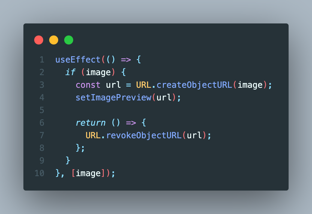 클린업 함수를 사용하여 입력받은 이미지 파일의 미리 보기 URL 을 만들었다.