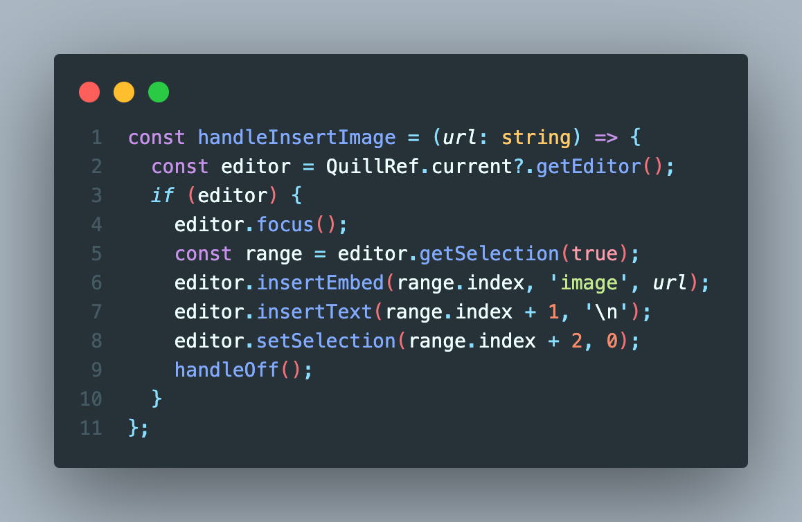 getSelection메서드를 사용해 현재 커서 위치를 가져옴 insertEmbed메서드로 현재 커서 위치에 'image' 에 입력받은 url 을 삽입- 사용자 경험성을 위해 줄바꿈을 추가하고 커서를 이동