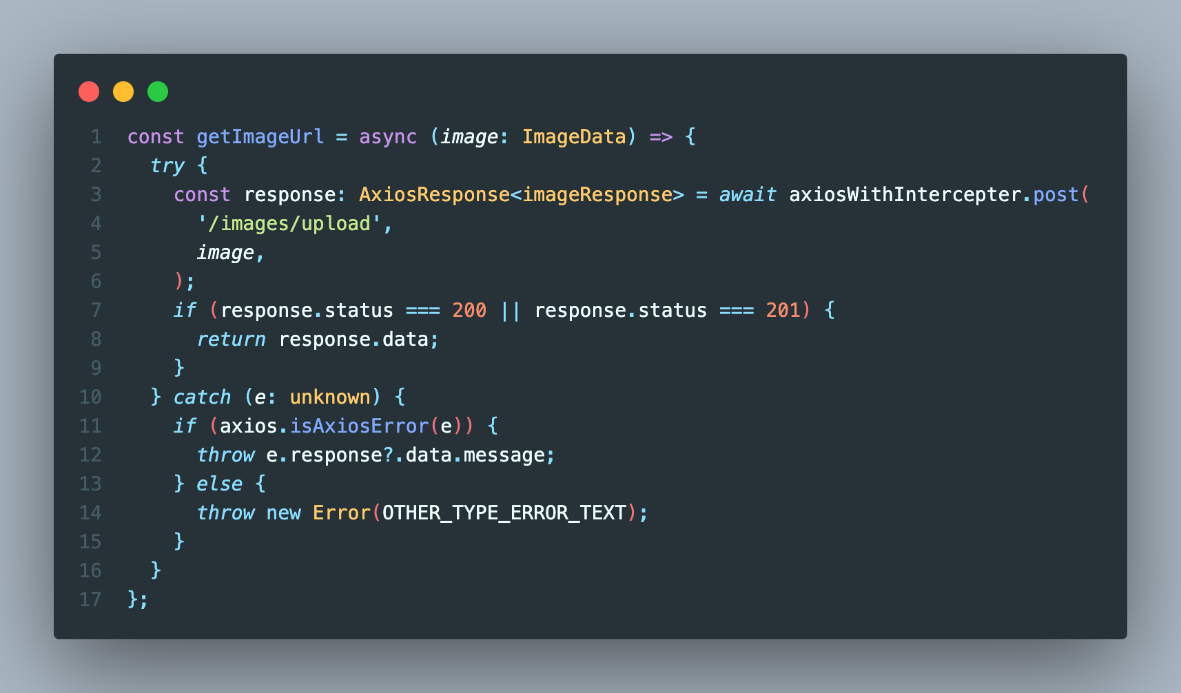 try-catch 문을 사용하여 이미지가 있을 경우 이미지를 객체로 생성하고 getImageUrl 함수를 호출하여 백엔드에 이미지를 업로드한다. 그러면 업로드된 이미지의 URL 을 포함한 응답을 handleImageUrl 함수를 호출하여 받은 이미지 URL 을 처리한다.