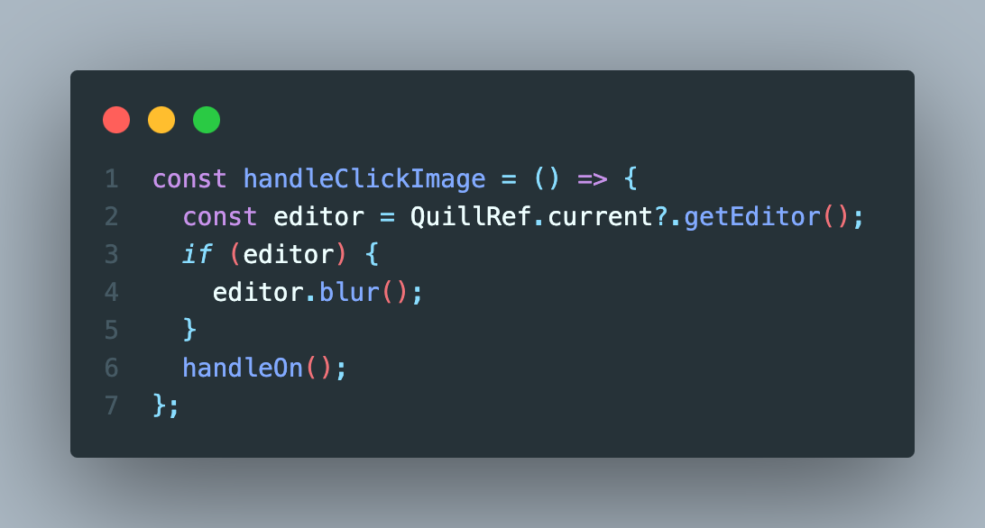 그래서 이미지 모달을 열었을 때 Quill 에디터 인스턴스를 useRef 로 가져온 후 blur 메서드를 사용하여 포커스를 해제하였다.