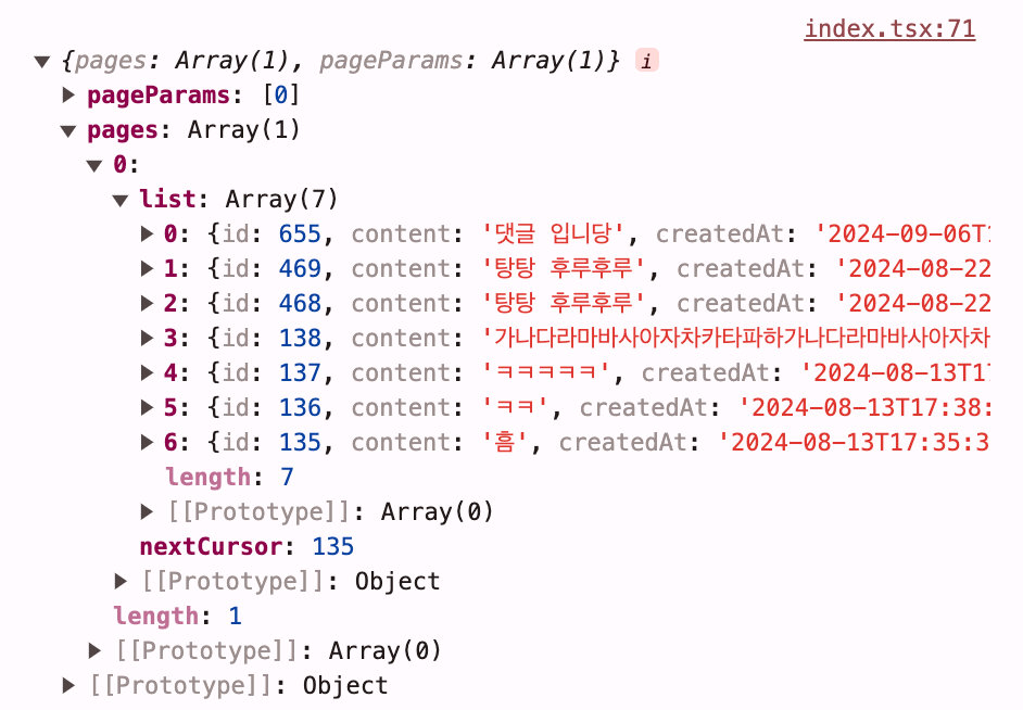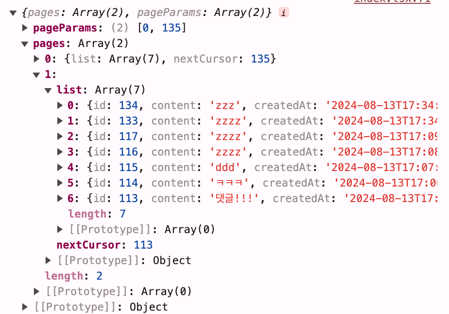 처음 렌더링된 댓글을 출력하면 다음과 같이 pages 0번 안에 서버에서 받아온 데이터가 들어있는 것을 알 수 있다.