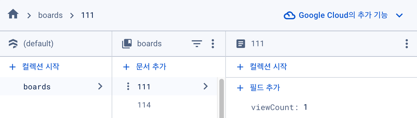 boards 라는 컬렉션을 만들고 게시물 id 를 문서로 추가하여 viewCount 에 조회수를 담았다.
