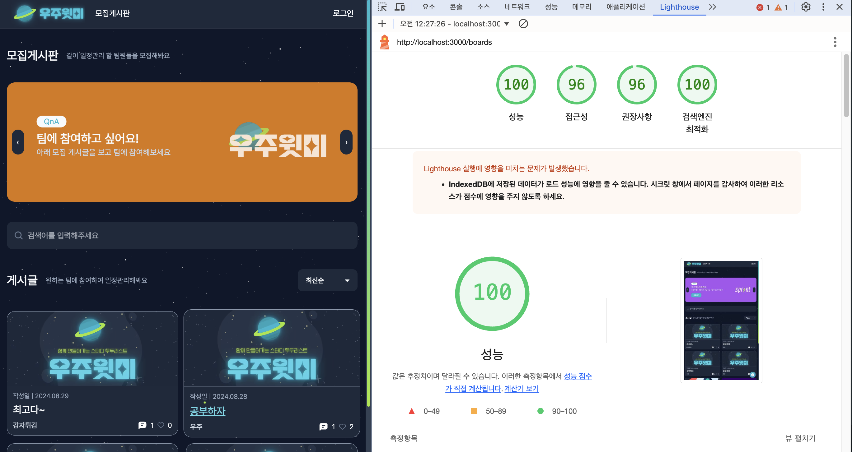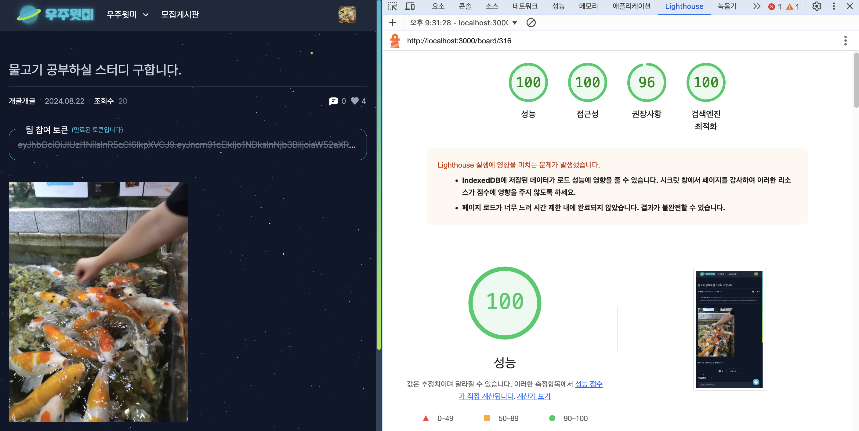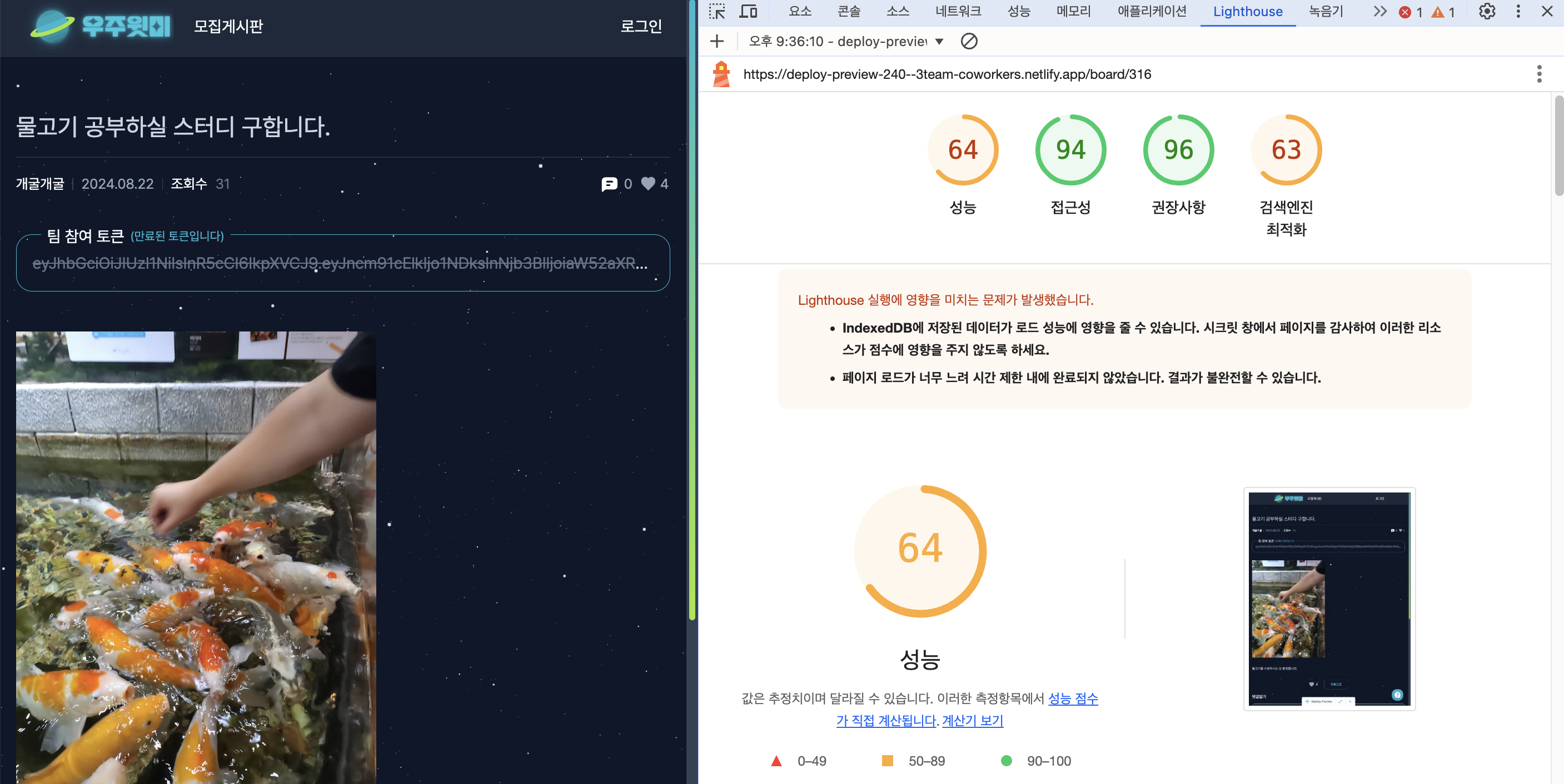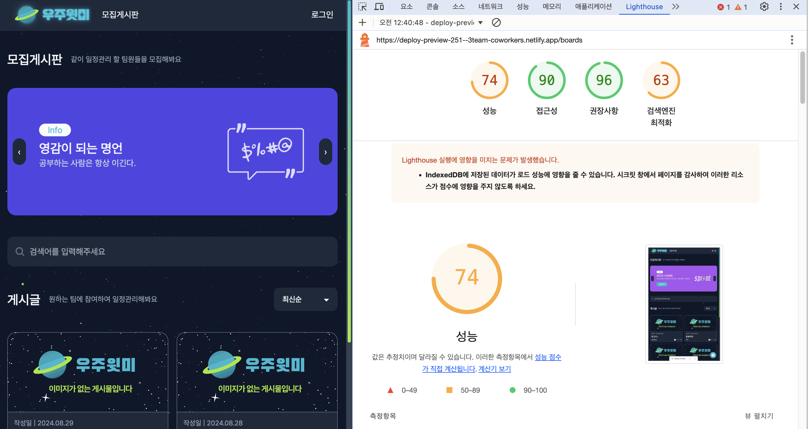 "우주윗미" 프로젝트 개발을 다 마치고 리팩토링 기간 때, Lighthouse 를 돌려봤는데 74, 64 라는 처참한 결과가 나왔다 😅