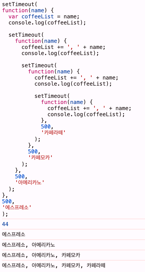 각 콜백은 커피 이름을 전달하고 목록에 이름을 추가한다. 들여쓰기가 과도하게 깊어졌을뿐더러 값이 전달되는 순서가 '아래에서 위로' 향하고 있어 어색하게 느껴진다.