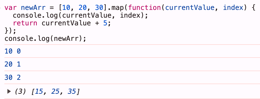 콜백 함수의 첫 번째 인자에는 배열의 요소 중 현재값이, 두 번째 인자에는 현재값의 인덱스가, 세 번째 인자에는 map 메서드의 대상이 되는 배열 자체가 담긴다.