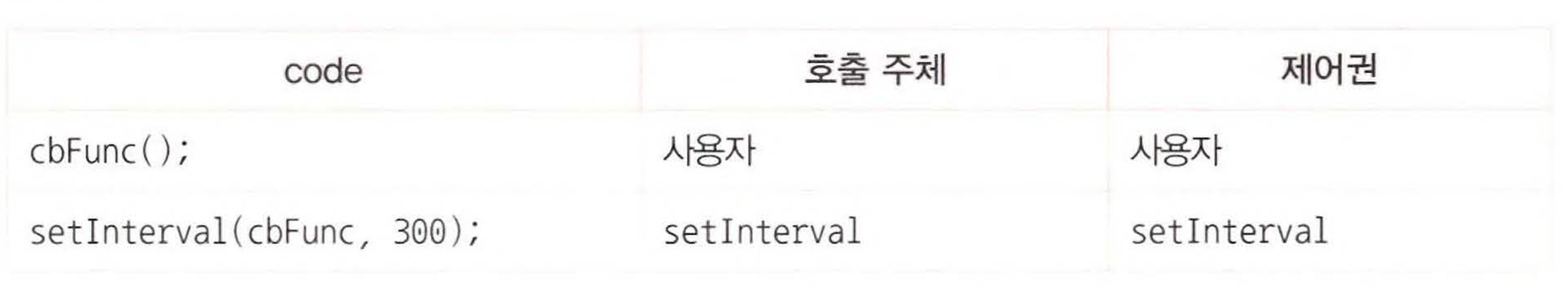 setInterval이라고 하는 '다른 코드'에 첫 번째 인자로서 cbFunc 함수를 넘겨주자 제어권을 넘겨받은 setInterval이 스스로의 판단에 따라 적절한 시점에(0.3초마다) 이 익명 함수를 실행한다. 이처럼 콜백 함수의 제어권을 넘겨받은 코드는 콜백 함수 호출 시점에 대한 제어권을 가진다.