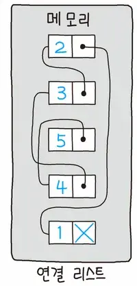 배열은 메모리에서 연속적으로 배치되어 있으나 연결 리스트는 순차적이지 않고 데이터가 퍼져있다.
