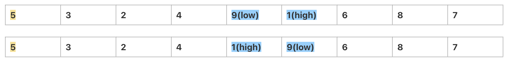 low 는 pivot 보다 작은 수, high 는 pivot 보다 큰 수이다.