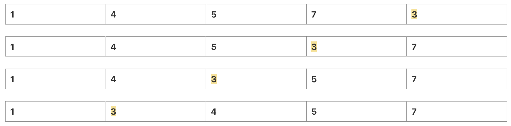 1은 4보다 작기 때문에, 4 앞으로 1을 삽입한다.