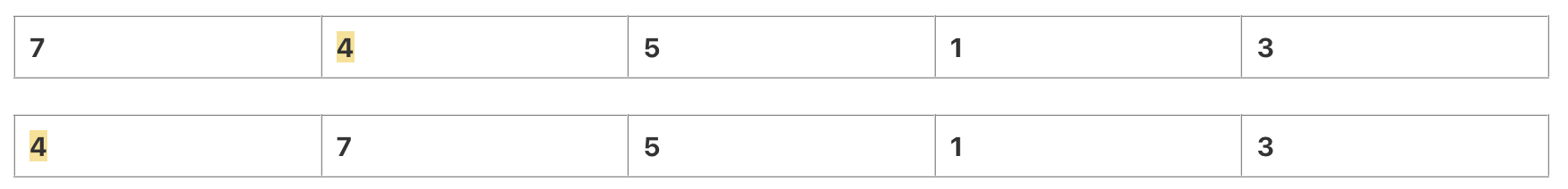 두번째 요소인 4부터 시작해서, 4가 7보다 작기 때문에 7 앞으로 4를 삽입한다.