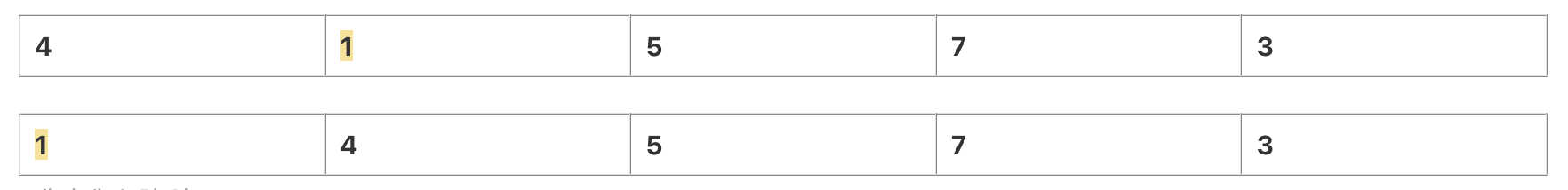 오름차순 정렬이기 때문에, 선택한 요소 7과 나머지 요소 중에서 가장 작은 요소 1을 교환한다.
