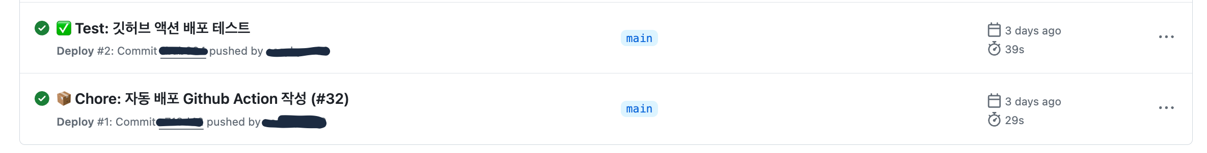 위에서 작성한 코드를 main 에 올리고 Actions 탭에 들어가 확인을 하면 정상적으로 배포되는 것을 확인할 수 있다.
