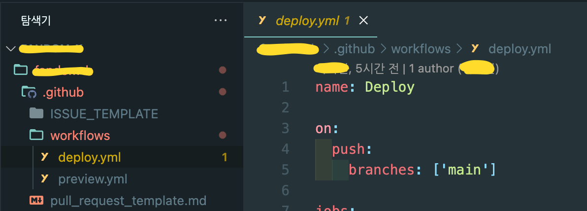 프로젝트의 루트 기준으로 .github/workflows/deploy.yml 이라는 경로에서 코드를 작성한다.