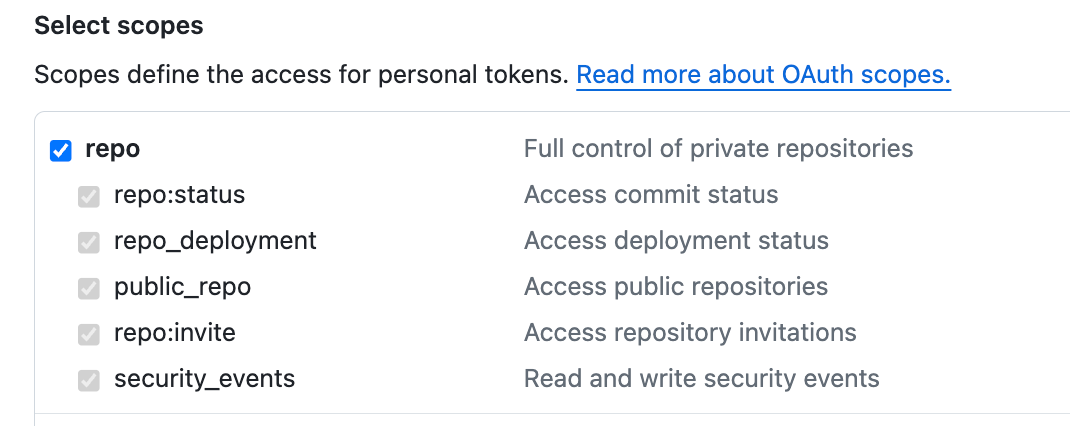 스코프(scopes) 는 아래 사진처럼 선택하여 토큰을 발급받는다.
