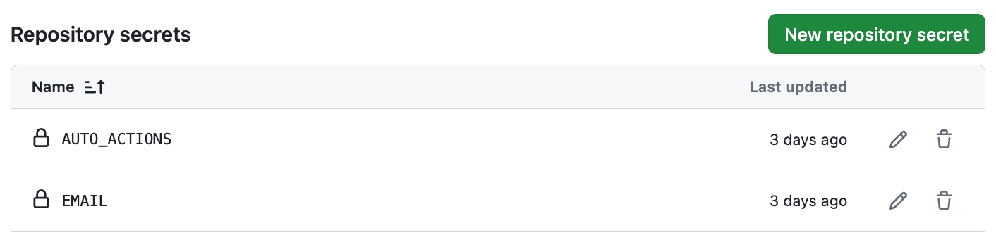 아까 위에서 발급받은 토큰(ghp_ 로 시작하는 거)을 AUTO_ACTIONS 에 저장하고, 본인 깃허브 계정 이메일을 EMAIL 에 저장한다.