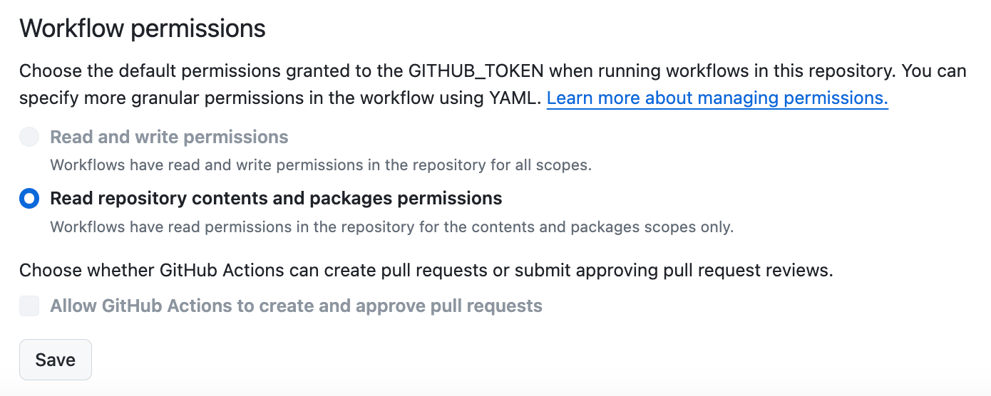 그래서 Settings -> Actions -> General 에서 Read and wrtie permissions 를 활성화하여 읽고 쓸 수 있는 권한을 줘야 한다.