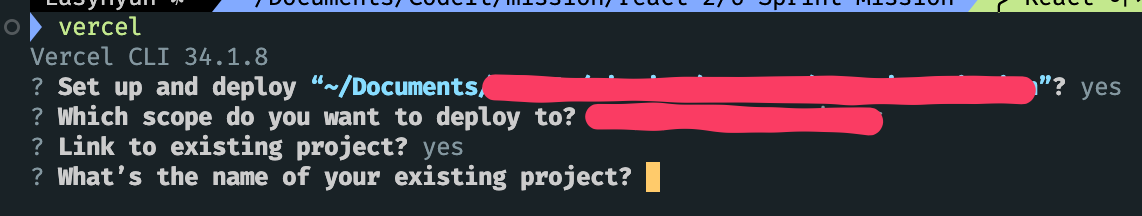 vercel 명령어를 입력하면 친절하게 질문을 하니깐 본인 상황에 맞게 알맞게 선택하고 입력하면 된다.