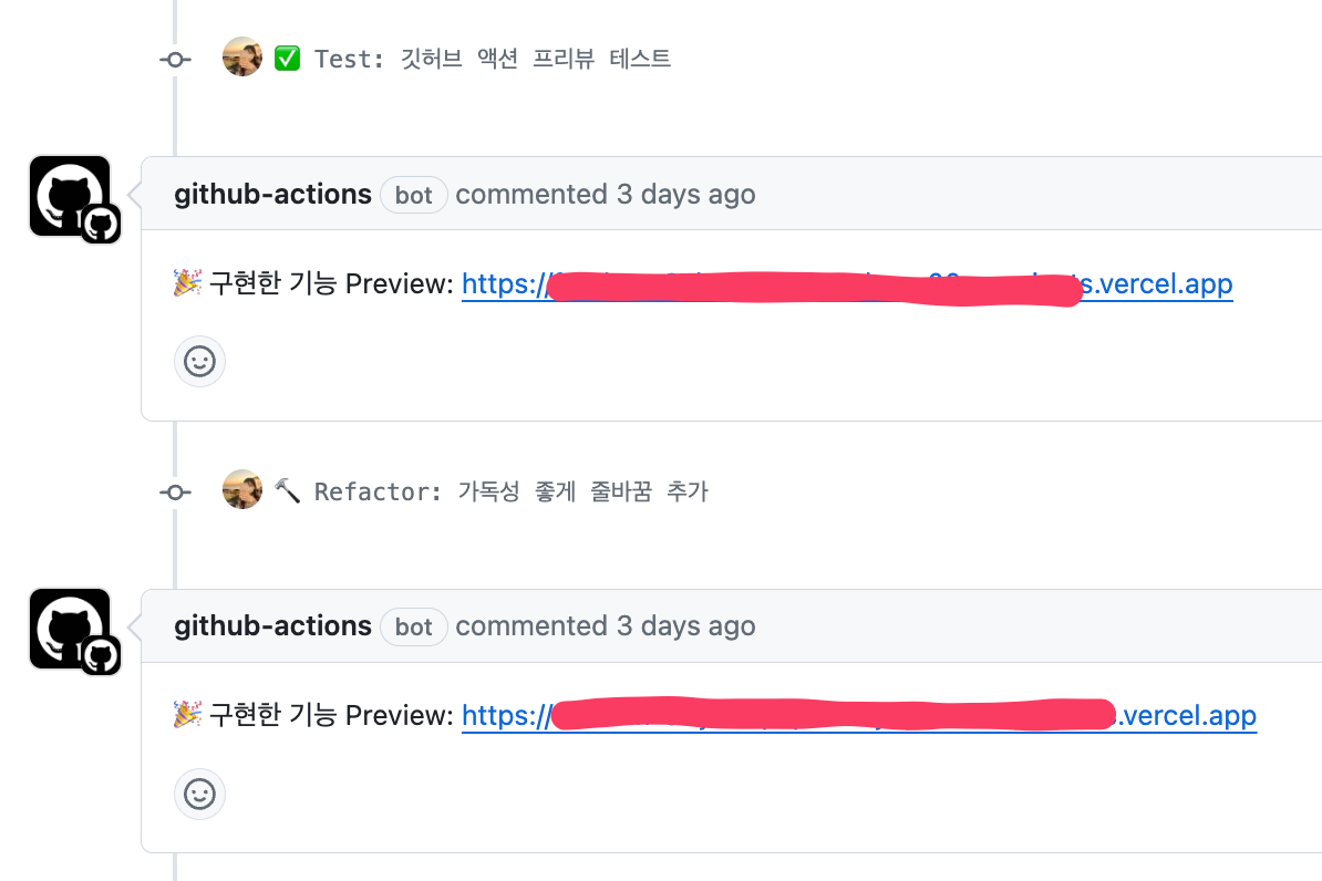 이러한 과정이 번거롭기 때문에 pull request 를 올렸을 때, 자동으로 vercel 로 미리 보기 preview 를 배포해야 한다.
