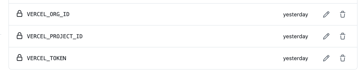 단계 1번에서 발급받은 vercel 토큰은 VERCEL_TOKEN, 단계 3번에서 발급받은 projectId 는 VERCEL_PROJECT_ID, orgId 는 VERCEL_ORG_ID 에 등록한다.