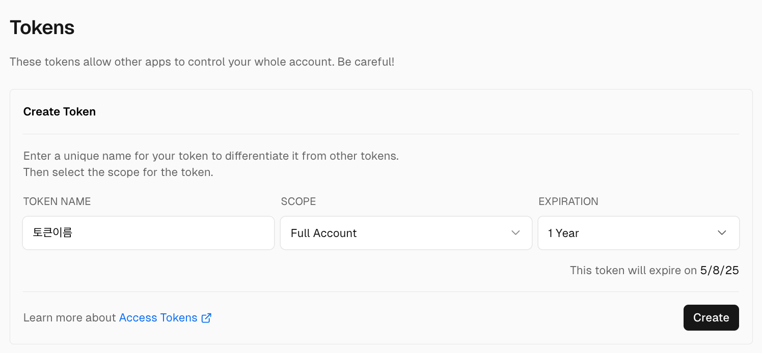 vercel 토큰을 발급받는 곳에서 토큰을 발급받는다. 발급 받은 토큰을 다시 볼 수 없으니깐 다른 곳에 메모해야 한다.