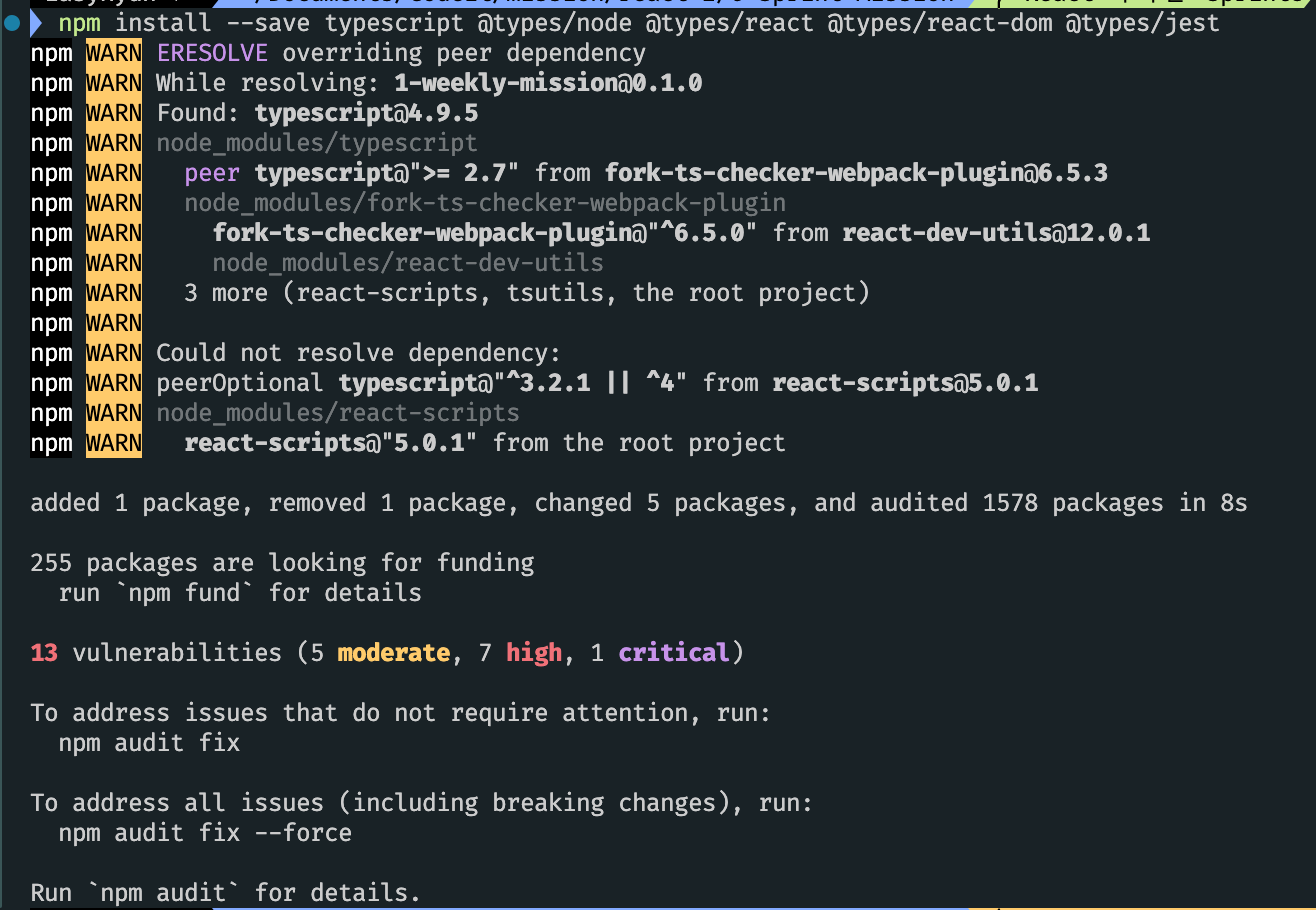 타입스크립트과 타입스크립트에 필요한 기타 모듈들을 설치한다.